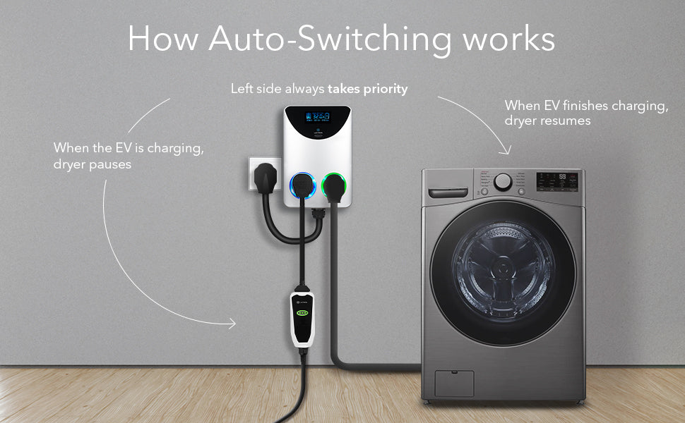 PRIORITIZED POWER SUPPLY: The NEMA socket splitter only sends power to one terminal at a time, and switches once the EV plugged into the charger in the primary socket is fully charged.